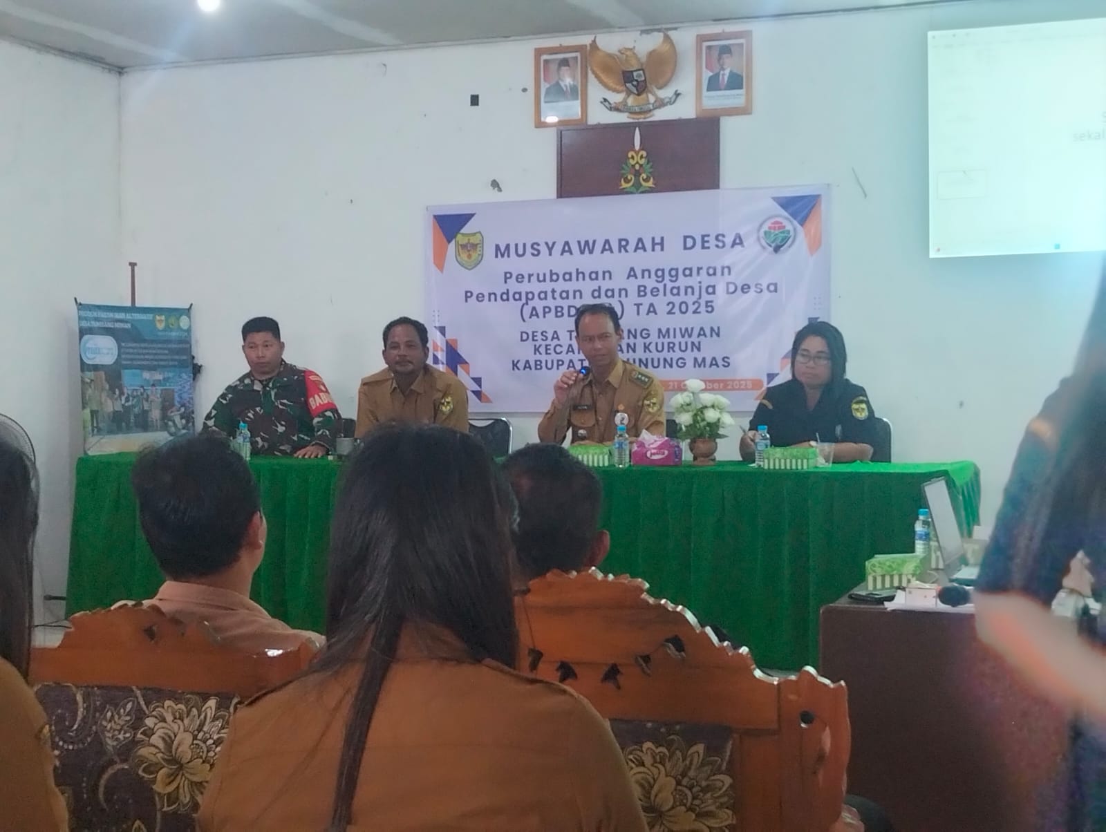 KUALA KURUN – Babinsa Koramil 04/Kurun Kodim 1018/Gunung Mas, Serda Susanto, menghadiri kegiatan Musyawarah Desa (Musdes) Perubahan Anggaran Pendapatan dan Belanja Desa (APBDes) Tahun 2025 di Desa Tumbang Miwan, Kecamatan Kurun, Kabupaten Gunung Mas, Selasa (21/10/2025).